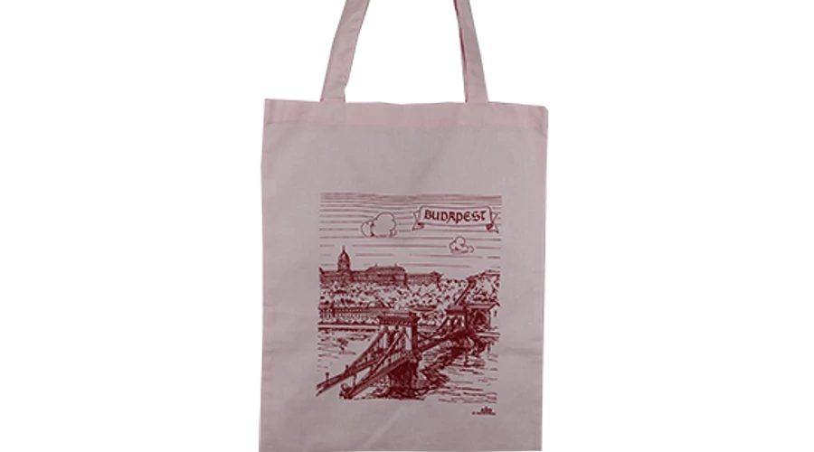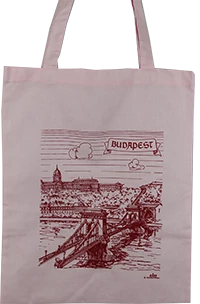 Táska a Souvenir1 ajándék nagykereskedés kínálatában. Magyarországhoz kapcsolódó szuvenír. Színes, Budapest grafikás pamut vászontáska, Budapest felirattal. Magyar termék.