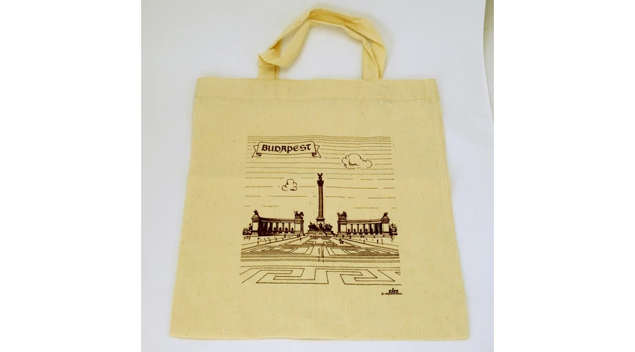 Táska a Souvenir1 ajándék nagykereskedés kínálatában. Magyarországhoz kapcsolódó szuvenír. Nyers színű vászontáska, Budapest felirattal. A táskát díszítő grafikán a Hősök tere látható. Magyar termék.