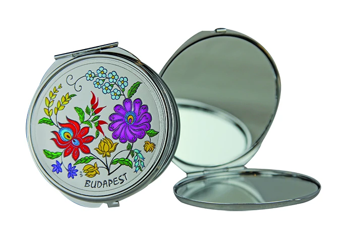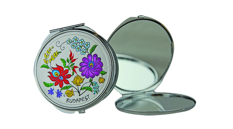 Tükör a Souvenir1 ajándék nagykereskedés kínálatában. Magyarországhoz kapcsolódó ajándéktárgy. Hungary felirattal. Ezüst színű kinyitható zsebtükör virág motívumokkal.