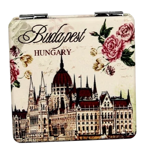 Tükör a Souvenir1 ajándék nagykereskedés kínálatában. Ezüst színű kinyitható zsebtükör a Parlament színes képével, Budapest és Hungary felirattal.