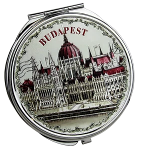 Tükör a Souvenir1 ajándék nagykereskedés kínálatában. Ezüst színű kinyitható zsebtükör a Parlament színes képével, Budapest felirattal.